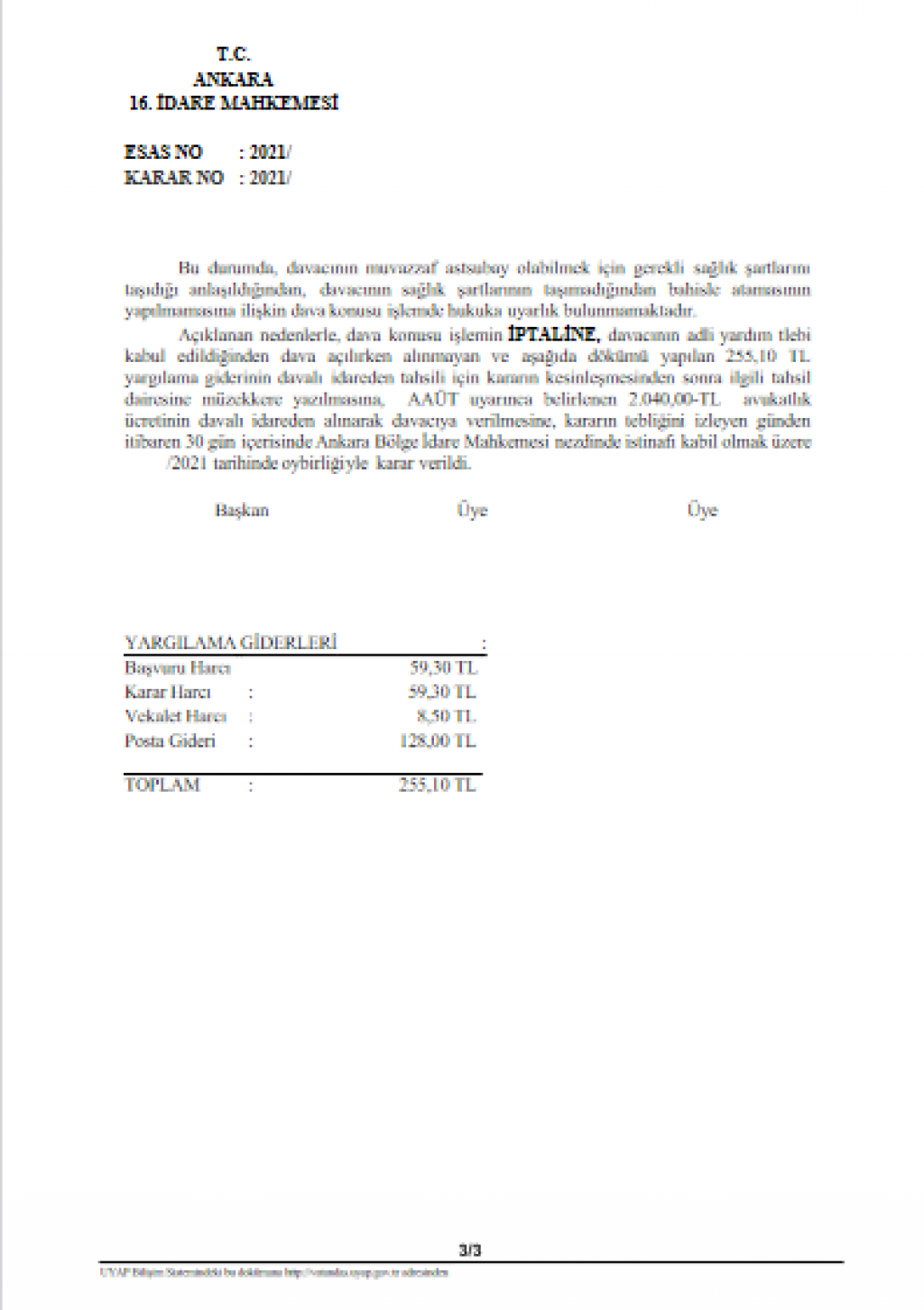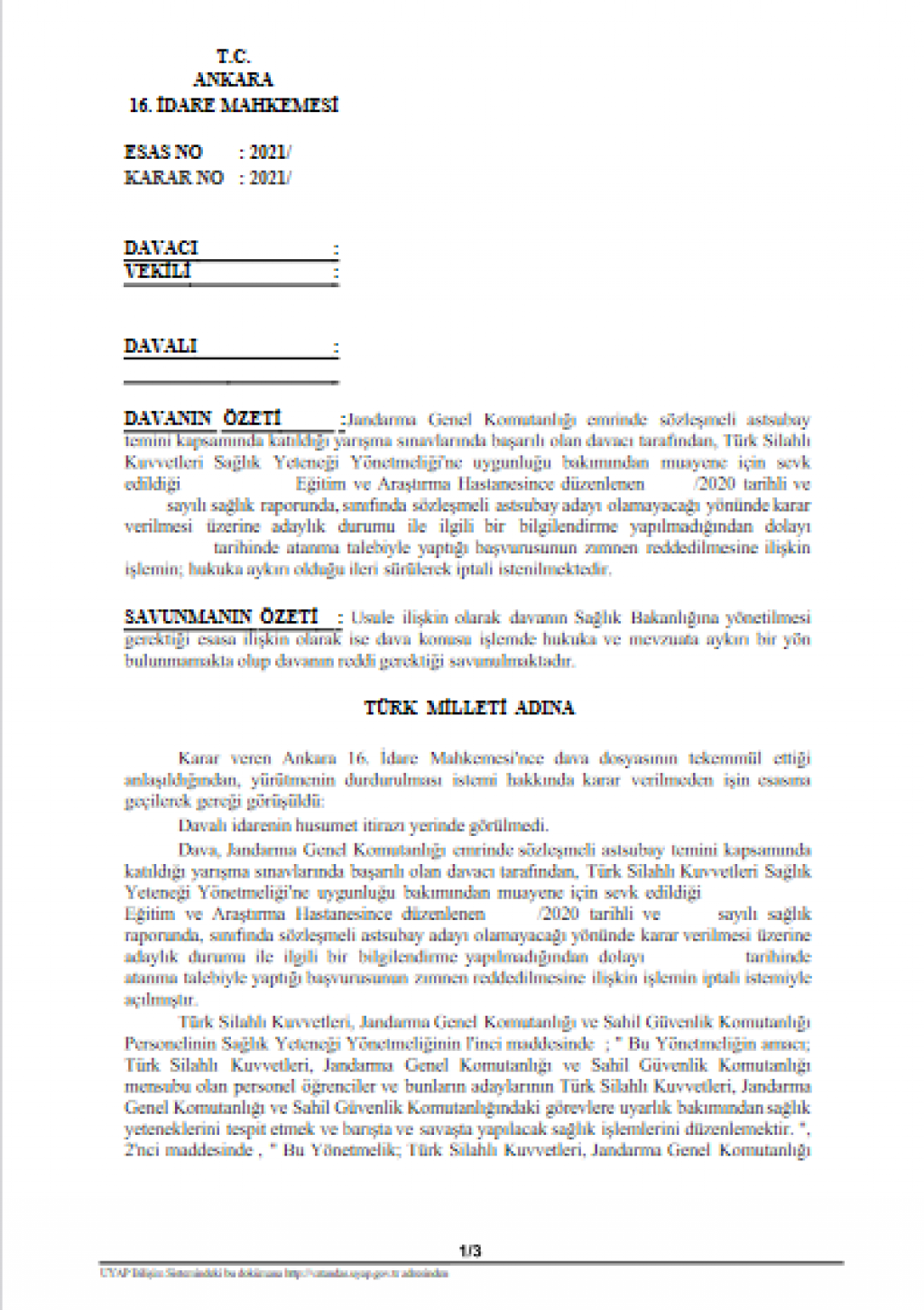 Jandarma Genel Komutanlığı emrinde sözleşmeli astsubay temini kapsamında katıldığı yarışma sınavlarında başarılı olan davacıya, Türk Silahlı Kuvvetleri Sağlık Yeteneği Yönetmeliği'ne uygunluğu bakımından muayene için sevk edildiği hastanede düzenlenen sağlık raporunda " 16/A F.1 Geçirilmiş Nevrotik Bozukluk tanısı ile sözleşmesi astsubay olamaz, komando olamaz', yönünde karar verilmesi üzerine adaylığı sonlandırılması işlemine karşı açılan iptal davasında, davacının sağlık şartlarının taşımadığından bahisle atamasının yapılmamasına ilişkin dava konusu işlemde hukuka uyarlık bulunmadığı gerekçesiyle dava konusu işlemin iptaline karar verilmiştir.