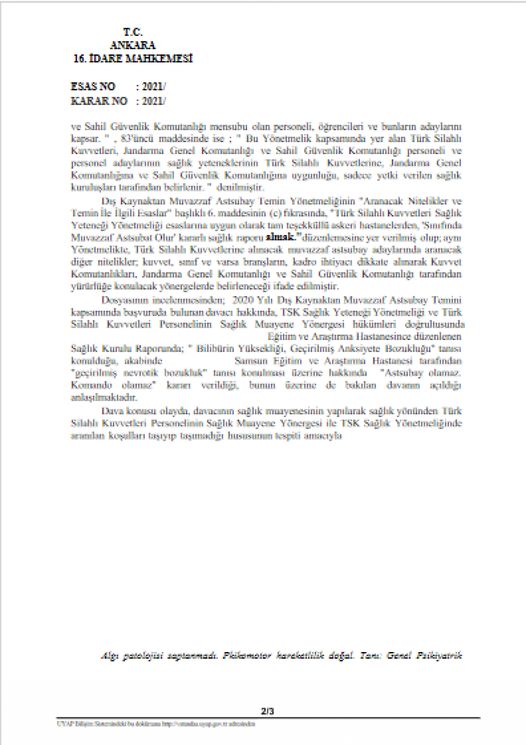 "16/A-F.1 Geçirilmiş Nevrotik Bozukluk" Tanısı Nedeniyle Hakkında "Sözleşmeli Astsubay Olamaz." Kararı Verilen Astsubay Adayı Hakkında Emsal Karar