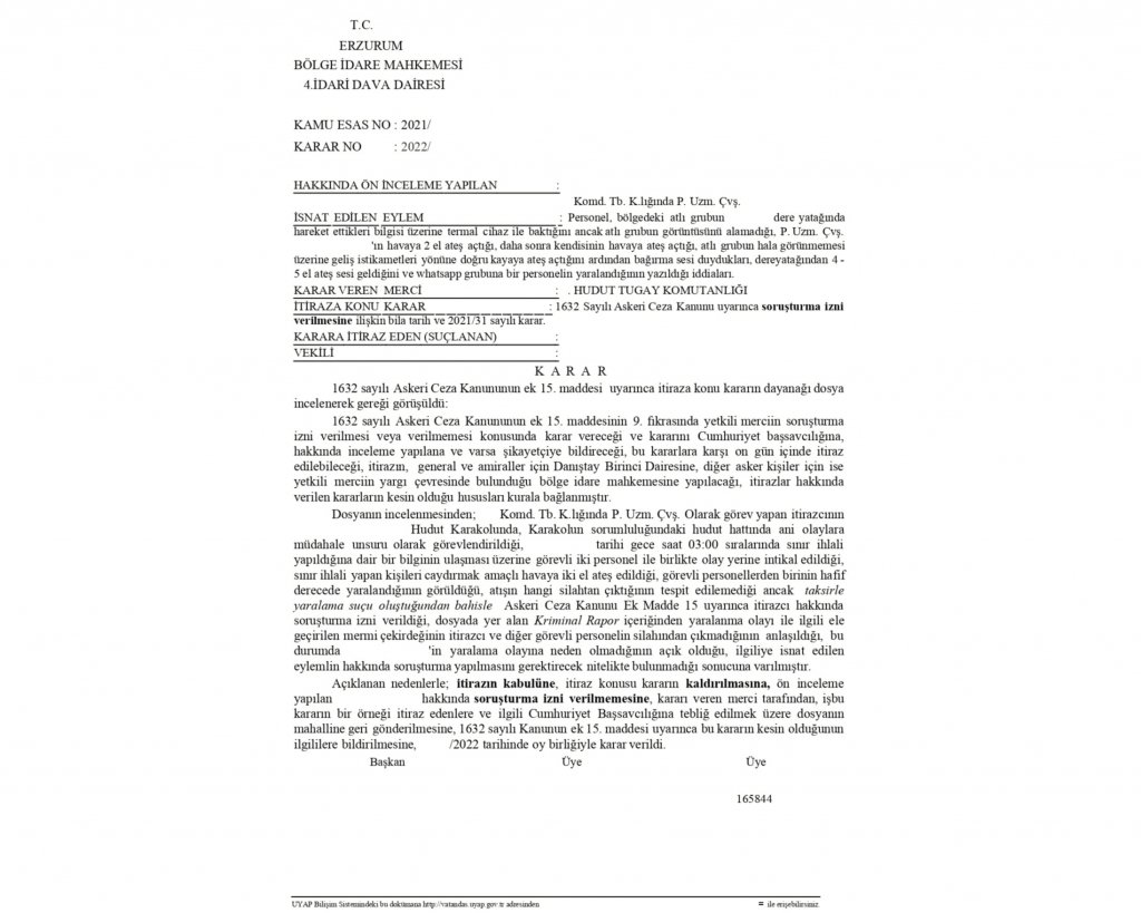 Uzman çavuşun, meydana geren yaralama olayına neden olmadığı ve isnat edilen eylemin hakkında soruşturma yapılmasını gerektirecek nitelikte bulunmadığı gerekçesiyle soruşturma izni verilmesine yönelik kararın kaldırılması talebiyle Bölge İdare Mahkemesine itirazda bulunulmuştur.